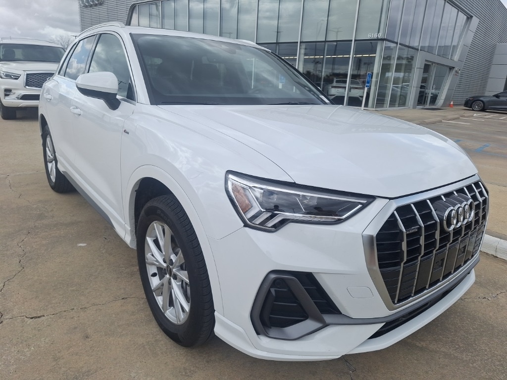 This 2025 White Audi Q3 Premium AWD S Line quattro is well equipped and includes these features and benefits: Convenience Package (Alarm with Motion Sensor, Audi Advanced Key, Auto-Dimming Power-Folding Exterior Mirrors, Auto-Dimming Rear-View Mirror, Driver Seat Memory, and Wireless Phone Charging Pad), 10 Speakers, 4-Wheel Disc Brakes, ABS brakes, Air Conditioning, Alloy wheels, AM/FM radio, Audi Beam-Rings, Audi Guard Protection Kit, Audi smartphone interface (Apple CarPlay/Android Auto), Auto High-beam Headlights, Automatic temperature control, Brake assist, Bumpers: body-color, Delay-off headlights, Driver door bin, Driver vanity mirror, Dual front impact airbags, Dual front side impact airbags, Electronic Stability Control, Emergency communication system: Audi connect CARE, Exterior Parking Camera Rear, Four wheel independent suspension, Front anti-roll bar, Front Bucket Seats, Front Center Armrest, Front dual zone A/C, Front fog lights, Front reading lights, Fully automatic headlights, Heated door mirrors, Heated Front Bucket Seats, Heated front seats, Illuminated entry, Knee airbag, Leather Seating Surfaces, Leather Shift Knob, Leather steering wheel, Low tire pressure warning, Occupant sensing airbag, Outside temperature display, Overhead airbag, Overhead console, Panic alarm, Passenger door bin, Passenger vanity mirror, Power door mirrors, Power driver seat, Power Liftgate, Power moonroof: Panoramic, Power passenger seat, Power steering, Power windows, Radio data system, Radio: Audi Sound System, Rain sensing wipers, Rear air conditioning, Rear anti-roll bar, Rear reading lights, Rear seat center armrest, Rear window defroster, Rear window wiper, Remote keyless entry, Speed control, Speed-sensing steering, Split folding rear seat, Spoiler, Steering wheel mounted audio controls, Tachometer, Telescoping steering wheel, Tilt steering wheel, Traction control, Trip computer, Turn signal indicator mirrors, Variably intermittent wipers, and Wheels: 18" 5-V-Spoke-S Design.