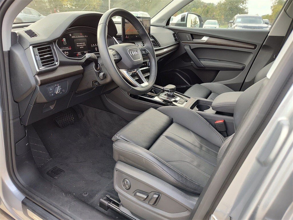 This 2025 Silver Metallic Audi Q5 45 S line Premium Plus AWD quattro is well equipped and includes these features and benefits: LED Interior Lighting Plus Package, Premium Plus Package (Audi Virtual Cockpit Plus, Bang & Olufsen 3D Sound System, Driver Seat Memory, Panoramic Sunroof, Power Adjustable Steering Column, Radio: MMI Navigation Plus, Top View Camera System, and Traffic Sign Recognition), 10 Speakers, 4-Wheel Disc Brakes, ABS brakes, Air Conditioning, Alloy wheels, AM/FM radio, AM/FM Stereo, Auto High-beam Headlights, Auto-dimming Rear-View mirror, Automatic temperature control, Brake assist, Bumpers: body-color, Compass, Delay-off headlights, Driver door bin, Driver vanity mirror, Dual front impact airbags, Dual front side impact airbags, Electronic Stability Control, Emergency communication system: Audi connect CARE, Exterior Parking Camera Rear, Four wheel independent suspension, Front anti-roll bar, Front Bucket Seats, Front Center Armrest, Front dual zone A/C, Front fog lights, Front reading lights, Garage door transmitter: HomeLink, Genuine wood console insert, Genuine wood dashboard insert, Genuine wood door panel insert, Heated door mirrors, Heated front seats, Heated Front Sport Seats, Heated steering wheel, Illuminated entry, Leather Seating Surfaces, Leather Shift Knob, Leather steering wheel, Low tire pressure warning, Occupant sensing airbag, Outside temperature display, Overhead airbag, Overhead console, Panic alarm, Passenger door bin, Passenger vanity mirror, Power door mirrors, Power driver seat, Power Liftgate, Power passenger seat, Power steering, Power windows, Radio data system, Rain sensing wipers, Rear air conditioning, Rear anti-roll bar, Rear fog lights, Rear reading lights, Rear seat center armrest, Rear window defroster, Rear window wiper, Remote keyless entry, Roof rack, Security system, Speed control, Speed-sensing steering, Speed-Sensitive Wipers, Split folding rear seat, Spoiler, Steering wheel mounted audio controls, Tachometer, Telescoping steering wheel, Tilt steering wheel, Traction control, Trip computer, Turn signal indicator mirrors, Variably intermittent wipers, Wheels: 19" 5-Double-Arm Design Bi Color Finish, and Wheels: 20" 5-Arm Design.