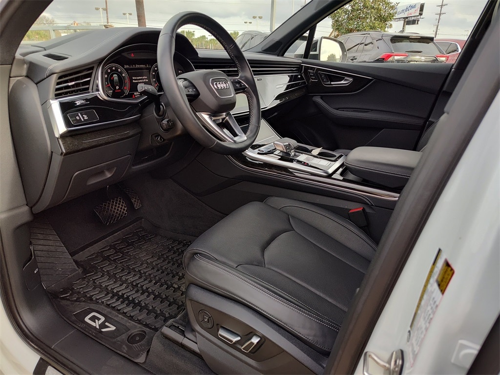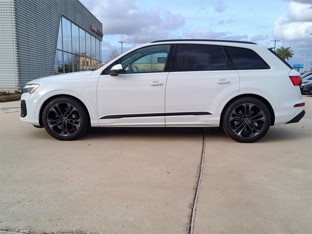 This 2025 Glacier White Audi Q7 55 Prestige AWD quattro is well equipped and includes these features and benefits: Black Optic Package (Black Exterior Trim, Black Grille, and Wheels: 21" 5-Double-Spoke-Design Matte Gray), Prestige Package (Bang & Olufsen Premium Sound System with 3D Sound, Illuminated Door Sills, Individual Contour Front Seats, and Intersection Assist), 10 Speakers, 3rd row seats: bench, 4-Wheel Disc Brakes, 7-Pin Adapter, ABS brakes, Air Conditioning, Alloy wheels, AM/FM radio: SiriusXM w/360L, Audi Beam Rings, Audi Guard Protection Kit, Auto High-beam Headlights, Auto-dimming door mirrors, Auto-dimming Rear-View mirror, Automatic temperature control, Brake assist, Bumpers: body-color, Compass, Delay-off headlights, Driver door bin, Driver vanity mirror, Dual front impact airbags, Dual front side impact airbags, Electronic Stability Control, Emergency communication system: Audi connect CARE, Exterior Parking Camera Rear, Four wheel independent suspension, Front anti-roll bar, Front Bucket Seats, Front Center Armrest, Front dual zone A/C, Front fog lights, Front reading lights, Fully automatic headlights, Garage door transmitter: HomeLink, Genuine wood door panel insert, Heated door mirrors, Heated Front Bucket Seats, Heated front seats, Illuminated entry, Leather Seating Surfaces, Leather Shift Knob, Leather steering wheel, Low tire pressure warning, Memory seat, Navigation system: Audi MMI Navigation plus with Touch Response, Occupant sensing airbag, Outside temperature display, Overhead airbag, Overhead console, Panic alarm, Passenger door bin, Passenger vanity mirror, Power door mirrors, Power driver seat, Power Liftgate, Power moonroof: Panoramic, Power passenger seat, Power steering, Power windows, Privacy Trunk Cover, Radio data system, Radio: Audi Sound System, Rain sensing wipers, Rear air conditioning, Rear anti-roll bar, Rear fog lights, Rear reading lights, Rear seat center armrest, Rear side impact airbag, Rear window defroster, Rear window wiper, Reclining 3rd row seat, Remote keyless entry, Security system, Speed control, Speed-sensing steering, Split folding rear seat, Spoiler, Steering wheel memory, Steering wheel mounted audio controls, Tachometer, Telescoping steering wheel, Tilt steering wheel, Traction control, Trailer Hitch, Trip computer, Turn signal indicator mirrors, Variably intermittent wipers, Wheels: 19" 5-Arm-Star Design, and Wireless Phone Charging Pad Delete.