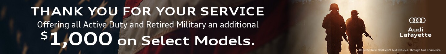 Here at Audi Lafayette, we're proud to offer military discounts to thank those who serve. If you are active duty or retired military, you can save $1,000 on select Audi models. We're immensely grateful for the sacrifices those in the military make, and we want to offer a token of our thanks. If you're looking for a new Audi model, then we encourage you to contact us to learn more about how you can save when you take advantage of our military discount.