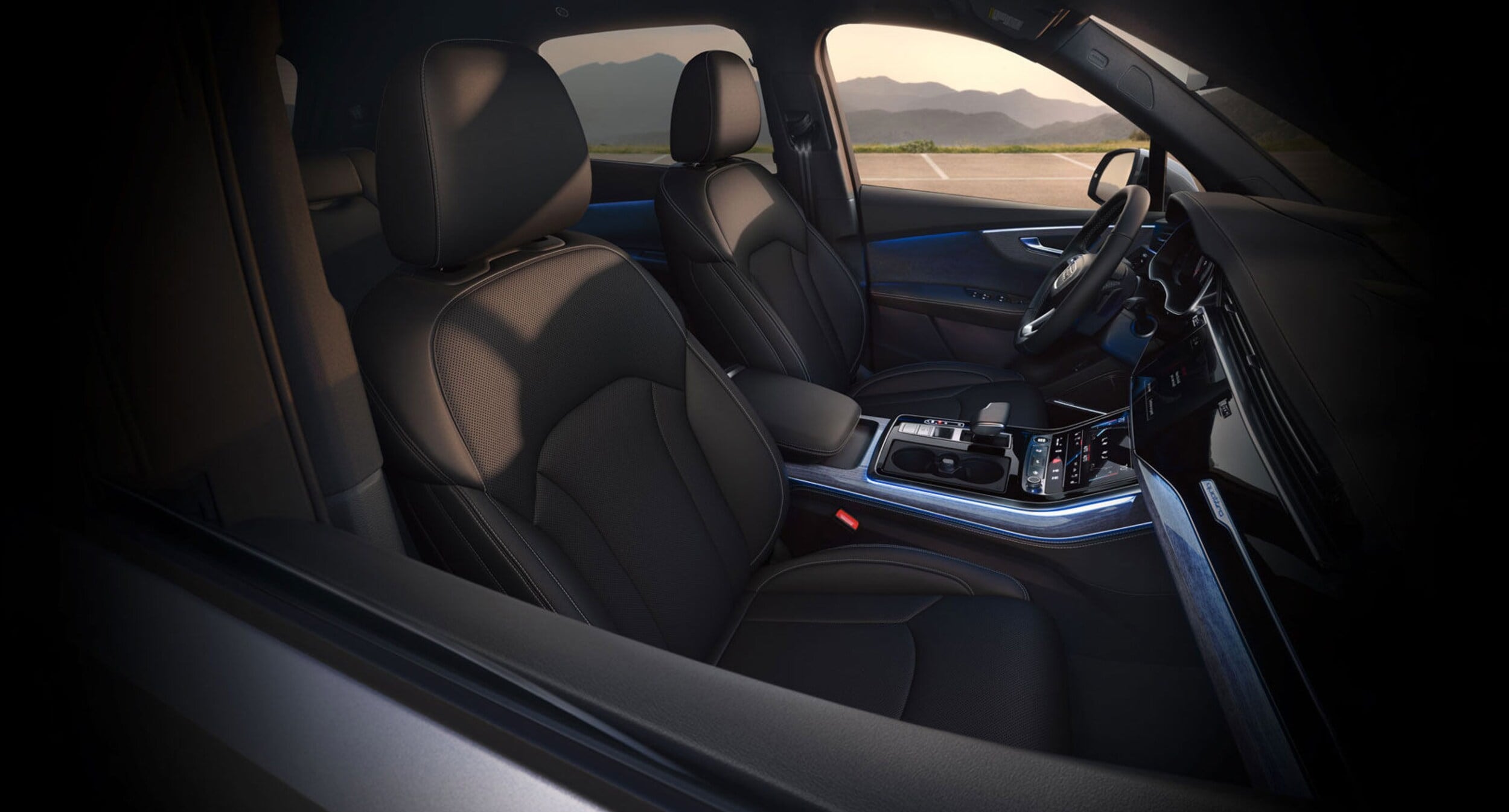 Leather upholstered seating and available extended leather accents on dashboard, armrests and upper doorsills