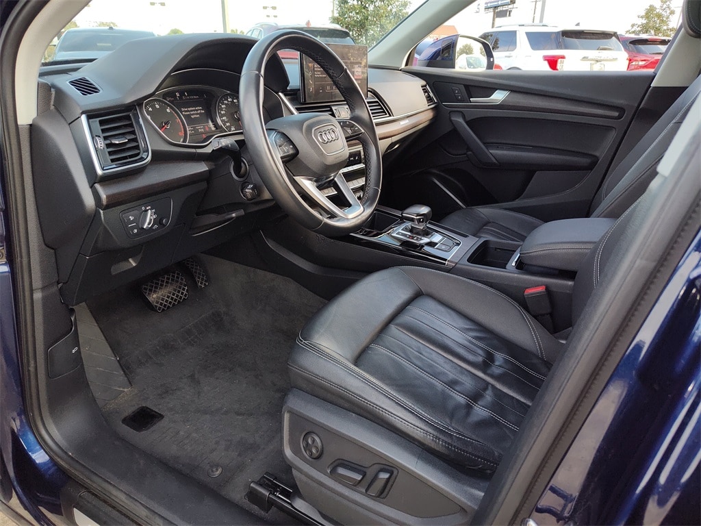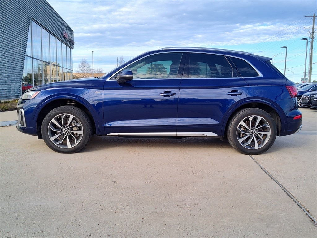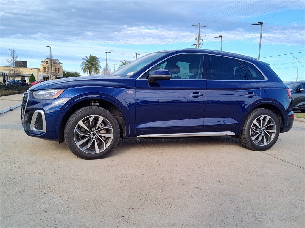 This 2022 Navarra Blue Metallic Audi Q5 45 S line Premium AWD quattro is well equipped and includes these features and benefits: 10 Speakers, 4-Wheel Disc Brakes, 5.302 Axle Ratio, ABS brakes, Air Conditioning, Alloy wheels, AM/FM radio, Auto High-beam Headlights, Auto-dimming Rear-View mirror, Automatic temperature control, Brake assist, Bumpers: body-color, Compass, Delay-off headlights, Driver door bin, Driver vanity mirror, Dual front impact airbags, Dual front side impact airbags, Electronic Stability Control, Emergency communication system: Audi connect CARE, Exterior Parking Camera Rear, Four wheel independent suspension, Front anti-roll bar, Front Bucket Seats, Front Center Armrest, Front dual zone A/C, Front fog lights, Front reading lights, Garage door transmitter: HomeLink, Genuine wood console insert, Genuine wood dashboard insert, Genuine wood door panel insert, Heated 8-Way Power Front Bucket Seats, Heated door mirrors, Heated front seats, Illuminated entry, Leather Seating Surfaces, Leather Shift Knob, Low tire pressure warning, Occupant sensing airbag, Outside temperature display, Overhead airbag, Overhead console, Panic alarm, Passenger door bin, Passenger vanity mirror, Power door mirrors, Power driver seat, Power Liftgate, Power passenger seat, Power steering, Power windows, Radio data system, Radio: Audi Sound System, Rain sensing wipers, Rear air conditioning, Rear anti-roll bar, Rear fog lights, Rear reading lights, Rear seat center armrest, Rear window defroster, Rear window wiper, Remote keyless entry, Roof rack, Security system, Speed control, Speed-sensing steering, Speed-Sensitive Wipers, Split folding rear seat, Spoiler, Steering wheel mounted audio controls, Tachometer, Telescoping steering wheel, Tilt steering wheel, Traction control, Trip computer, Turn signal indicator mirrors, Variably intermittent wipers, and Wheels: 18" 5-Arm-Star Design.
